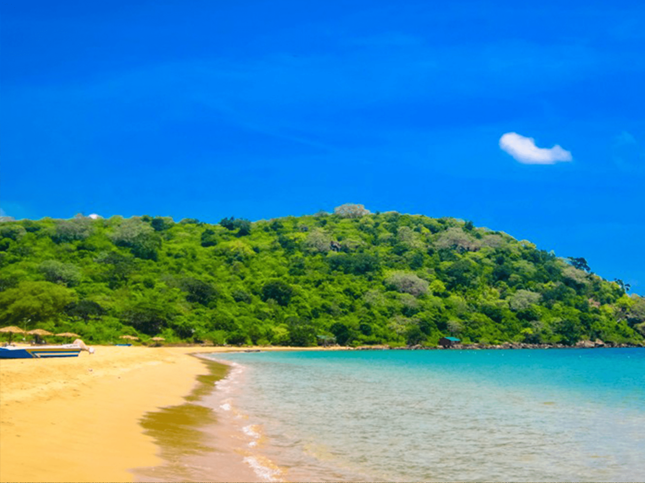 The beach itself is lined with palm trees, providing plenty of shade from the hot sun, and is dotted with colorful fishing boats bobbing in the turquoise waters. The beach is relatively wide and long, offering plenty of space for sunbathing, beach games, and leisurely walks.